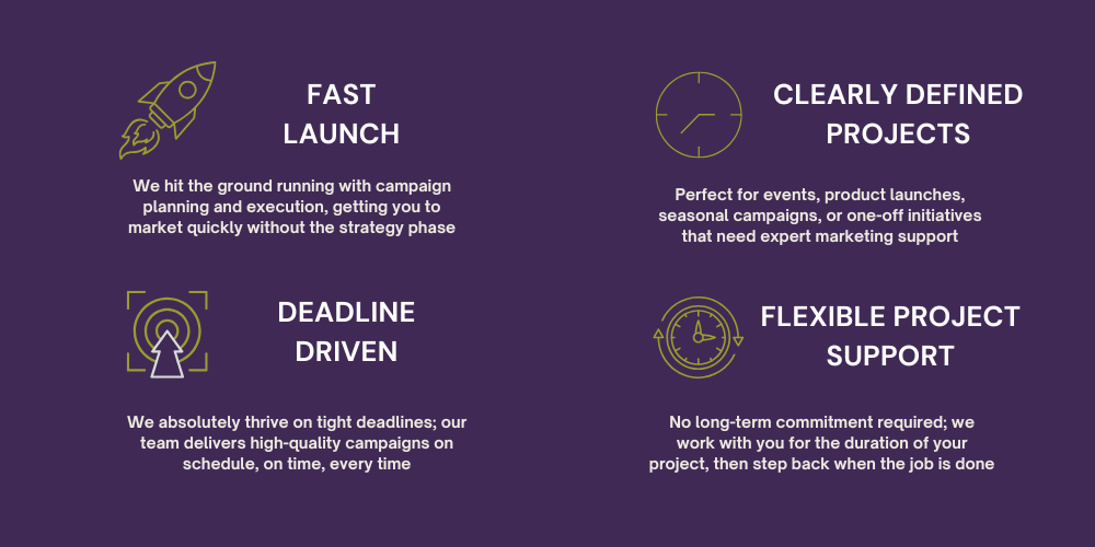 At this level, we focus on defined campaigns and projects rather than ongoing marketing activity, turning your initiatives into structured, well-executed campaigns that are aligned to your objectives, delivered on time and built to perform – from initial brief through to execution and results.At this level, we focus on defined campaigns and projects rather than ongoing marketing activity.