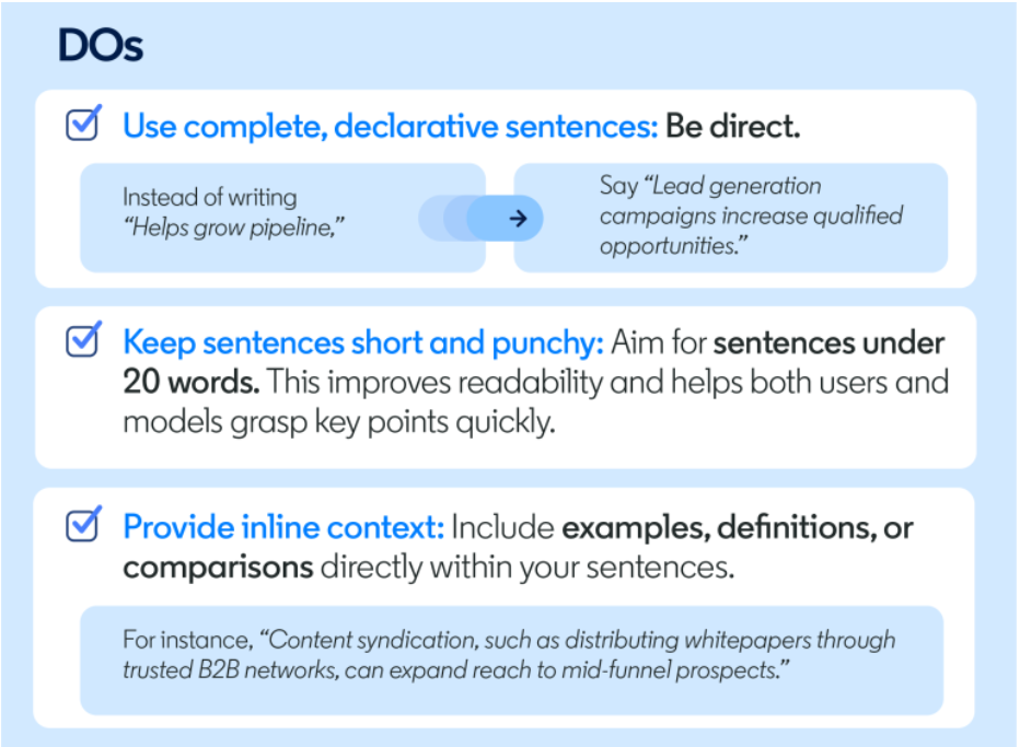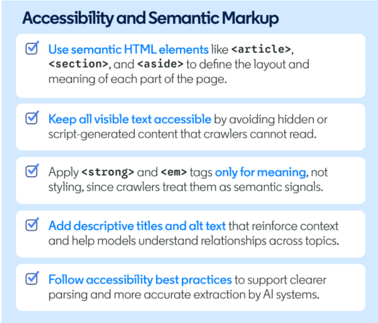- Ensure pages are accessible, fast, and properly structured so AI tools and search engines can easily index and interpret them.