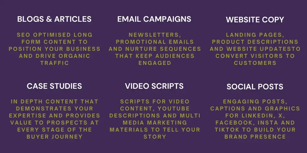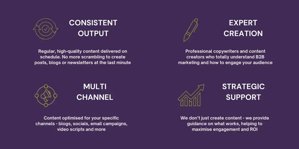 You tell us what you need, we create it. No lengthy stretgey sessions, no complex planning - just reliable professional content delivered on time, every time.