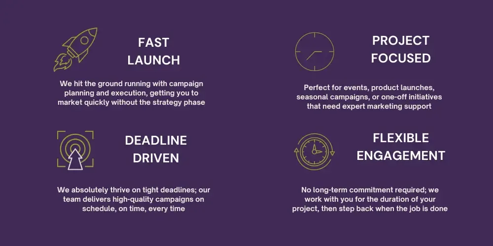 Ideal for events, product launches, seasonal campaigns, award entries, or any other marketing project with a clear scope and deadline. You get our full team's expertise focused on making your project a success.